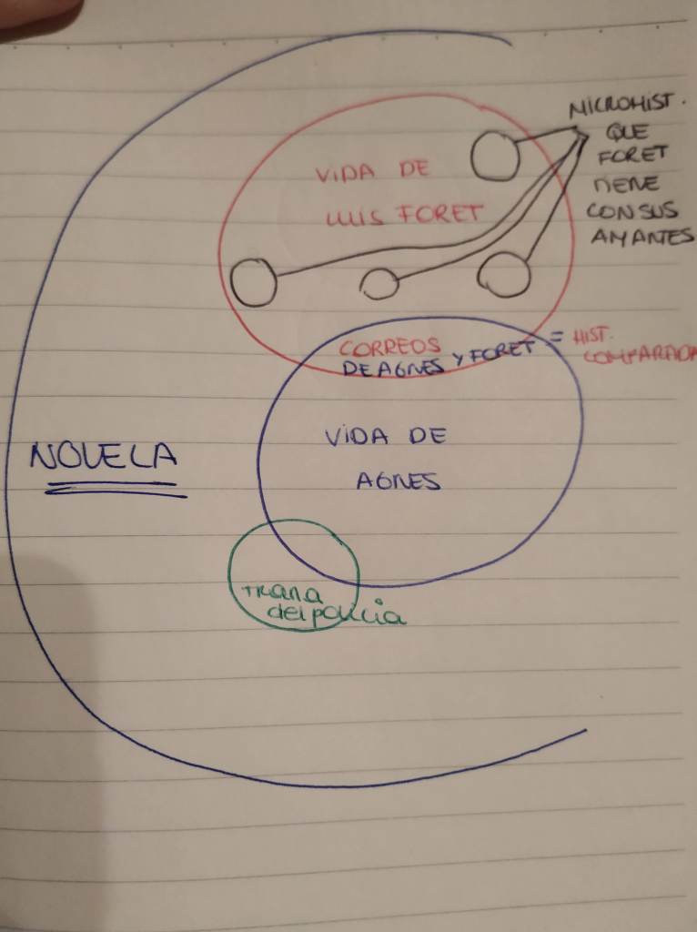 Por un lado está la novela que tenemos en las manos, que contiene: la trama del inicio, protagonizada por el policía que atiende a Agnes, la de la propia Agnes y la de Luis Foret. La trama del inicio no se desarrolla mucho, pero funciona como motor para que arranque la historia principal. Dentro de la vida de Luis Foret, están las microhistorias que explica de su vida, que a la vez son historias de otros personajes secundarios que, en determinados momentos, parecen personajes protagonistas. Y la historia de Agnes con Luis Foret, manifestada a través de los correos electrónicos que intercambian.